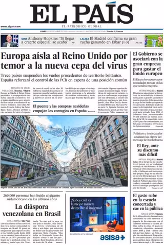 EL PAÍS: "Europa aísla al Reino Unido por temor a la nueva cepa del virus"; "La diáspora venezolana en Brasil. 260.000 personas han huido al gigante sudamericano en los últimos años"; "El Gobierno se asociará con la gran empresa para gastar el fondo europeo"; " El Rey, ante su discurso más difícil"; "El gasto sube en la escuela concertada y cae en la pública".