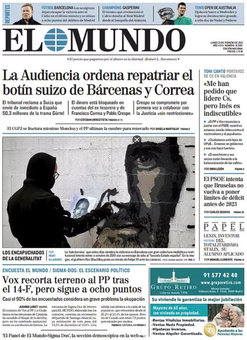 EL MUNDO: "La Audiencia ordena repatriar el botín suizo de Bárcenas y Correa"; "Vox recorta terreno al PP tras el 14F, pero sigue a ocho puntos"; "Toni Cantó, portavoz de Cs en Valencia: "Me han pedido que lidere Cs, pero Inés es indiscutible""; "El PSOE intenta que Bruselas no vuelva a poner límites de déficit antes de 2023".