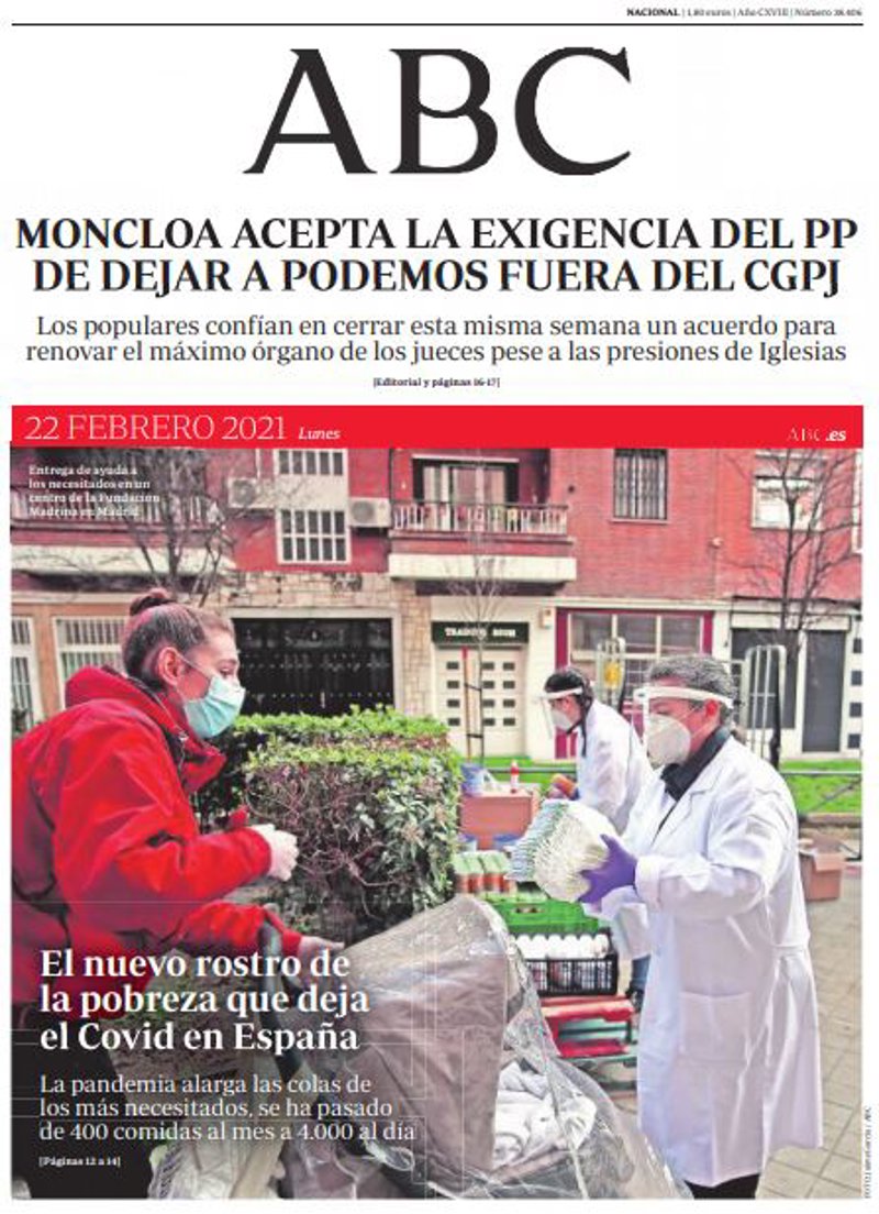 ABC: "Moncloa acepta la exigencia del PP de dejar a Podemos fuera del CGPJ. Los populares confían en cerrar esta misma semana un acuerdo para renovar el máximo órgano de los jueces pese a las presiones de Iglesias"; "El nuevo rostro de la pobreza que deja el Covid en España. La pandemia alarga las colas de los más necesitados, se ha pasado de 400 comidas al mes a 4.000 al día".