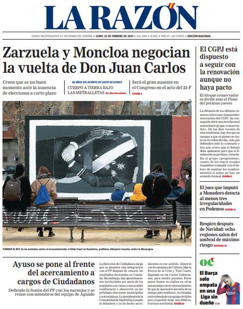 LA RAZÓN: "Zarzuela y Moncloa negocian la vuelta de Don Juan Carlos"; "Ayuso se pone al frente del acercamiento a cargos de Ciudadanos"; "El CGPJ está dispuesto a seguir con la renovación aunque no haya pacto"; "El juez que imputó a Monedero detecta al menos tres irregularidades en Podemos"; "Respiro después de Navidad: ocho regiones salen del umbral de máximo riesgo".