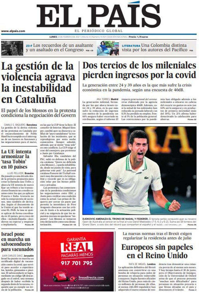 EL PAÍS: "La gestión de la violencia agrava la inestabilidad en Cataluña"; "Dos tercios de los mileniales pierden ingresos por la covid"; "La UE intenta armonizar la 'tasa Tobin' en 10 países"; "Israel pone en marcha un salvoconducto para vacunados"; "Europeos sin papeles en el Reino Unido. La nuevas normas tras el Brexit exigen regularizar la residencia antes de julio".