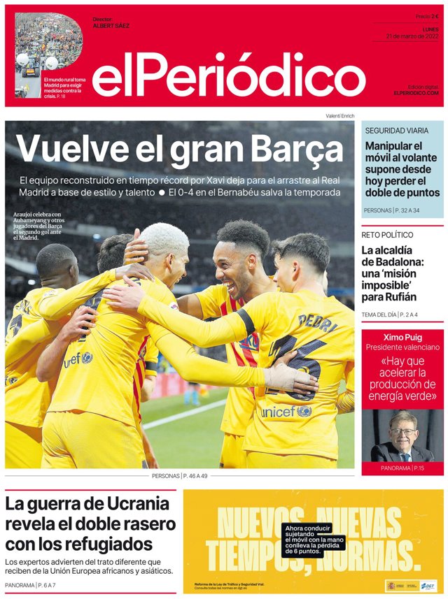 EL PERIÓDICO: "Vuelve el gran Barça"; "Manipular el móvil al volante supone desde hoy perder el doble de puntos";"La alcaldía de Badalona: una 'misión imposible' para Rufián"; "La guerra de Ucrania revela el doble rasero con los refugiados".