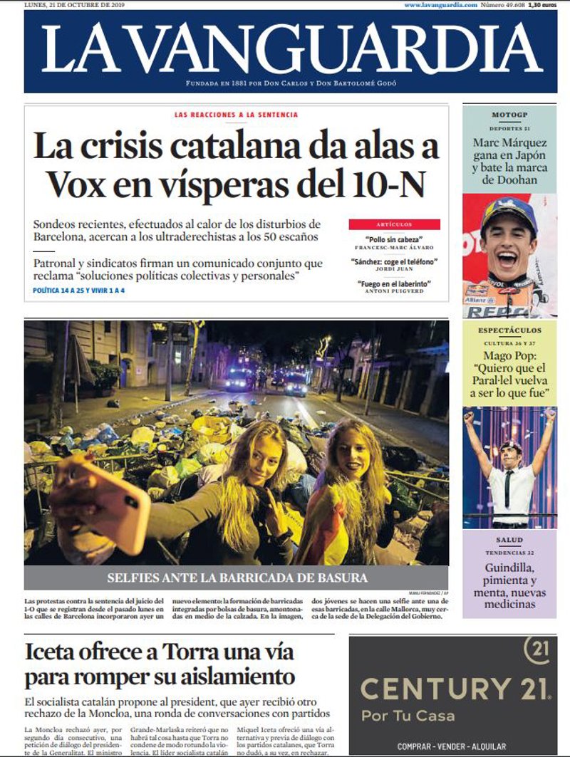 LA VANGUARDIA: "La crisis catalana da alas a Vox en vísperas del 10-N"; "Marc Márquez gana en Japón y bate la marca de Doohan"; "Iceta ofrece a Torra una vía para romper su aislamiento"; "Selfies ante la barricada de basura"; "Guindilla, pimienta y menta, nuevas medicinas".