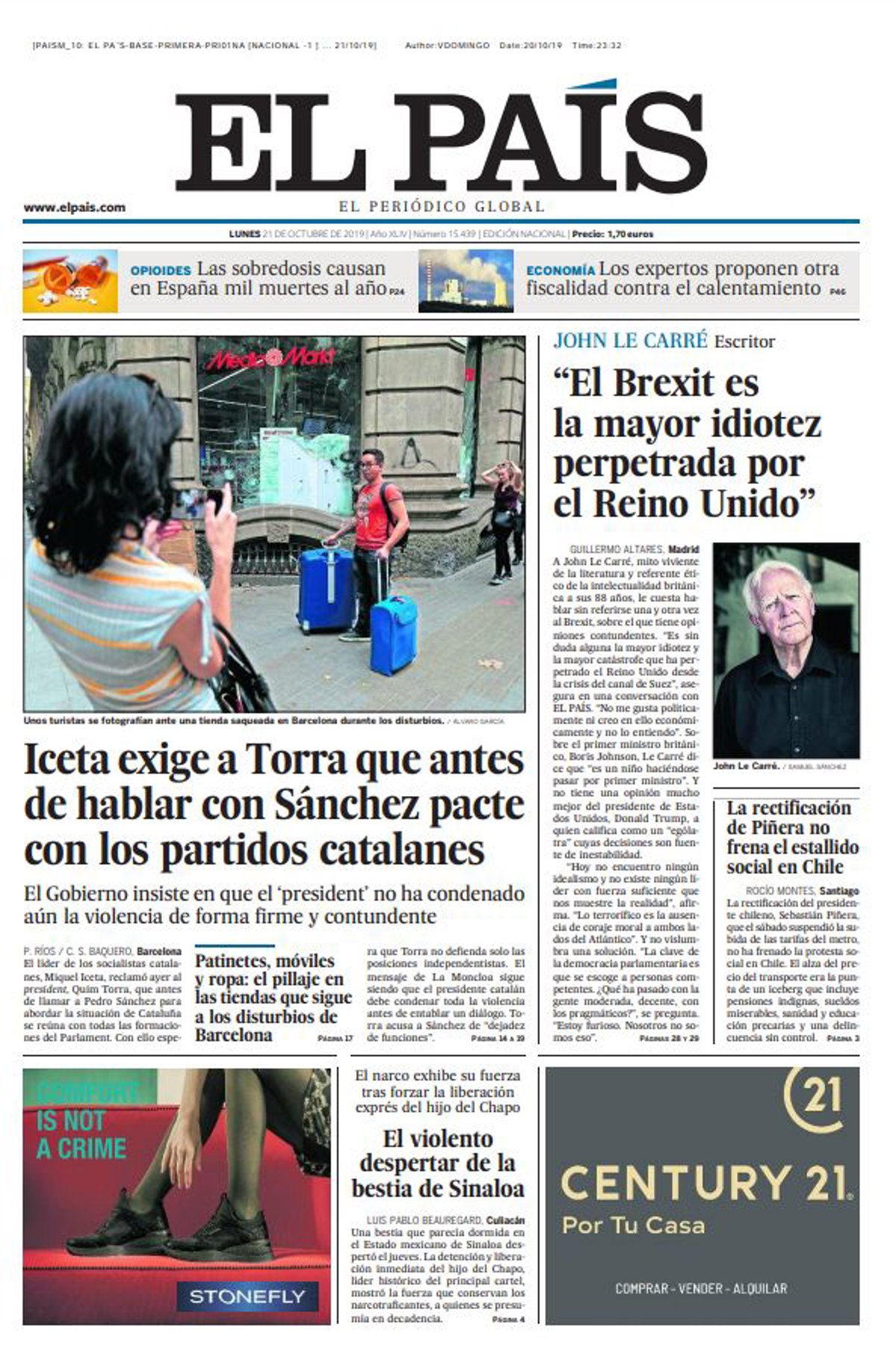EL PAÍS: "Iceta exige a Torra que antes de hablar con Sánchez pacte con los partidos catalanes"; "Patinetes, móviles y ropa: el pillaje en las tiendas que sigue a los disturbios de Barcelona"; John Le Carré: El Brexit es la mayor idiotez perpetrada por el Reino Unido"; "La rectificación de Piñera no frena el estallido social en Chile".