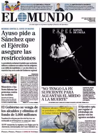 EL MUNDO: "Ayuso pide a Sánchez que el Ejército asegure las restricciones"; "Monedero e Isa Serra lideran las protestas contra las medidas"; "El Gobierno se venga de los alcaldes y elimina el fondo de 5.000 millones"; "El Ejecutivo opta por regular el teletrabajo sin pactar con los agentes sociales"; "Rafael de Paula: "No tengo la fe suficiente para aguantar el miedo a la muerte"".