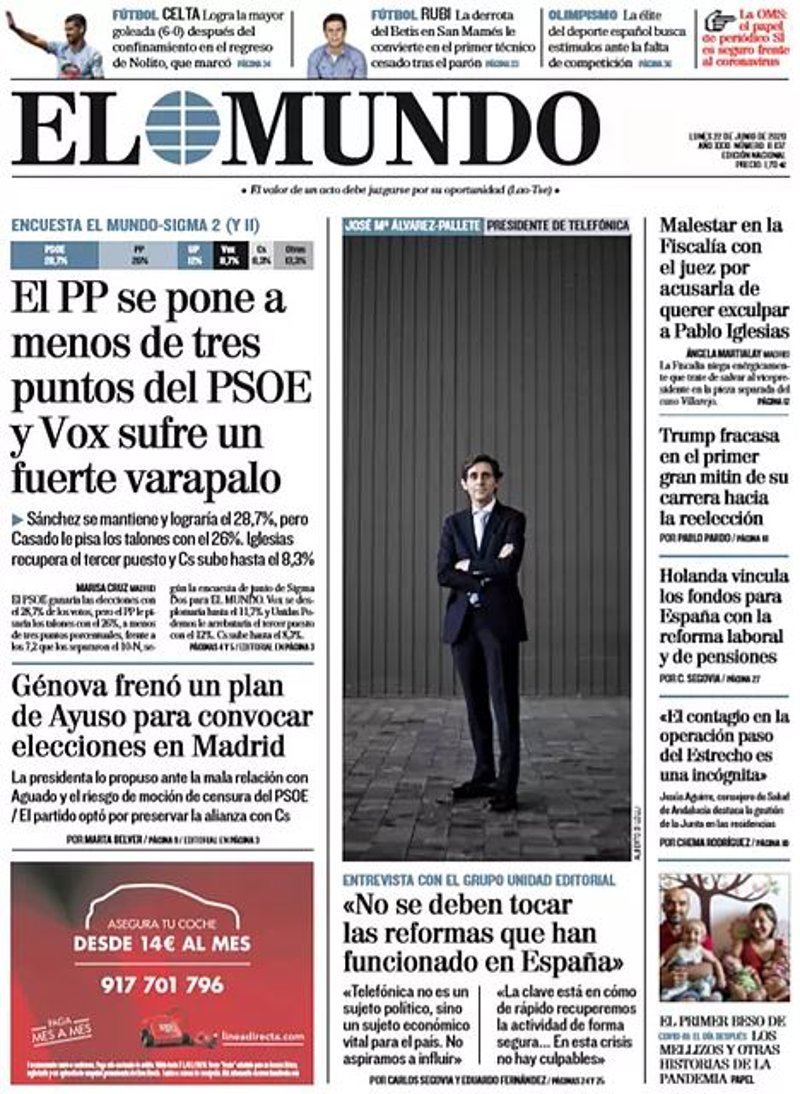 EL MUNDO: "El PP se pone a menos de tres puntos del PSOE y Vox sufre un fuerte varapalo"; "Génova frenó un plan de Ayuso para convocar elecciones en Madrid"; "Álvarez-Pallete, presidente de Telefónica: "No se deben tocar las reformas que han funcionado en España"; "Malestar en la Fiscalía con el juez por acusarle de querer exculpar a Pablo Iglesias"; "Trump fracasa con el primer gran mitin de su carrera hacia la reelección"; "Holanda vincula los fondos para España con la reforma laboral y de pensiones"; "Jesús Aguirre, consejero de Salud de Andalucía: "El contagio en la operación paso del Estrecho es una incógnita"".