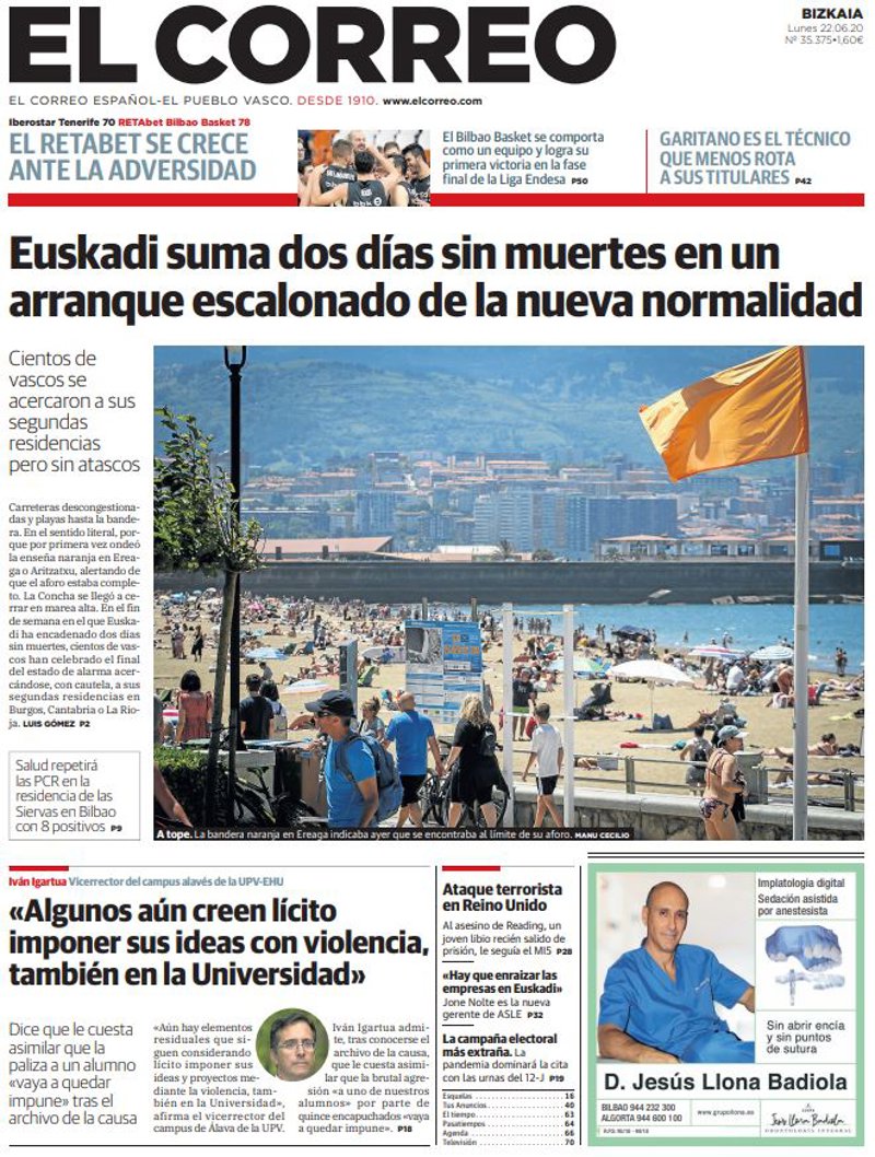EL CORREO: "Euskadi suma dos días sin muertes en un arranque escalonado de la nueva normalidad"; "Iván Igartua, ,icerrector del campus alavés de la UPV-EHU: "Algunos aún creen lícito imponer sus ideas con violencia, también en la Universidad"; "Ataque terrorista en Reino Unido. Al asesino de Reading, un joven libio recién salido de prisión, le seguía el MI5"; "Jone Nolte es la nueva gerente de ASL: "Hay que enraizar las empresas en Euskadi""; "La campaña electoral más extraña. La pandemia dominará la cita con las urnas del 12-J".