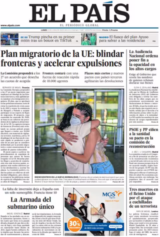 EL PAÍS: "Plan migratorio de la UE: blindar fronteras y acelerar expulsiones"; "La Armada del submarino único. La falta de inversión deja a España con un solo sumergible. Francia tiene 10"; "La Audiencia Nacional ordena poner fin a la opacidad en los altos cargos"; "PSOE y PP ciñen a la sanidad su pacto en la comisión de reconstrucción"; "Tres muertos en el Reino Unido por el ataque a cuchilladas de un terrorista".