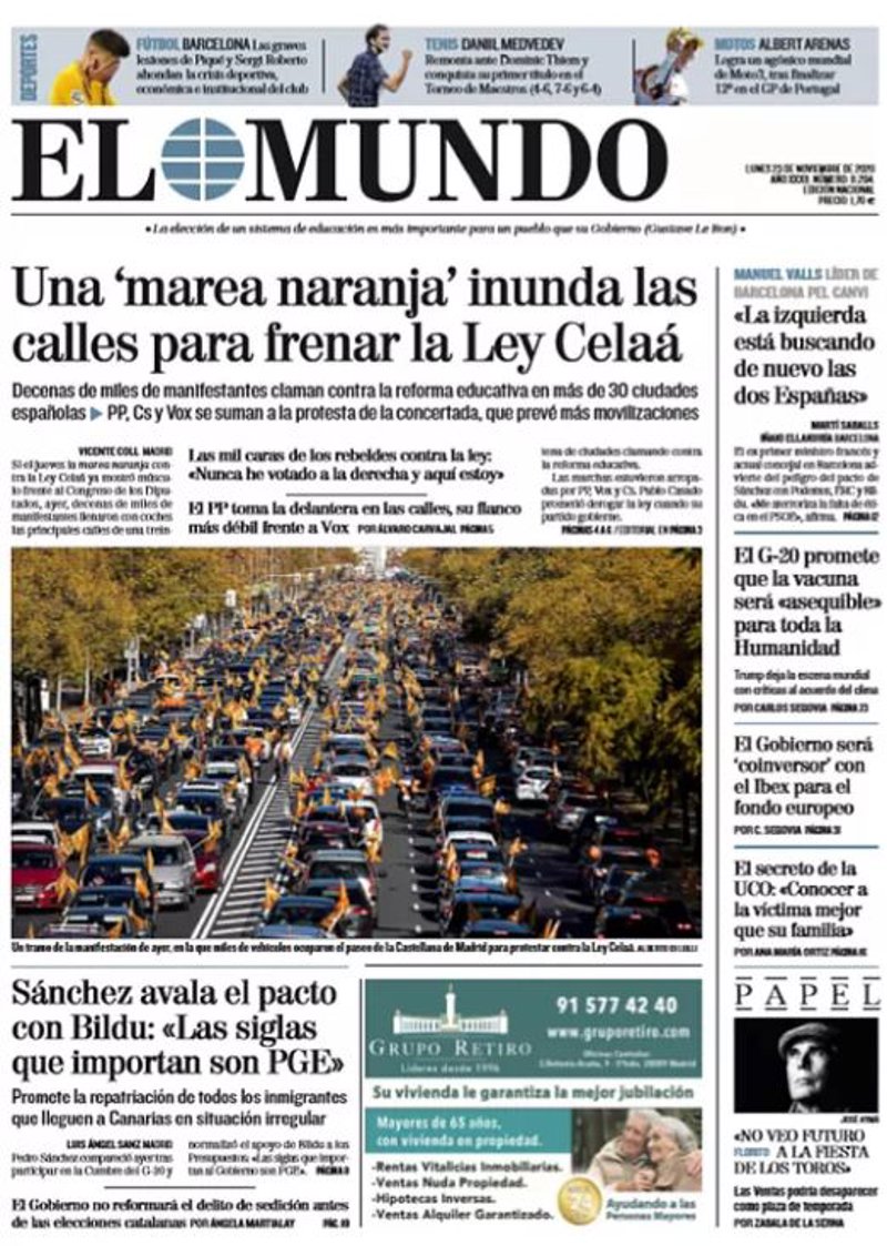 EL MUNDO: "Una 'marea naranja' inunda las calles para frenar la Ley Celaá"; "Sánchez avala el pacto con Bildu: "Las siglas que importan son PGE""; "Manuel Valls, líder de Barcelona pel Canvi: "La izquierda está buscando de nuevo las dos Españas""; "El G-20 promete que la vacuna será "asequible" para toda la Humanidad"; "El Gobierno será 'coinversor' con el Ibex para el fondo europeo"; "El secreto de la UCO: "Conocer a la víctima mejor que a su familia"".