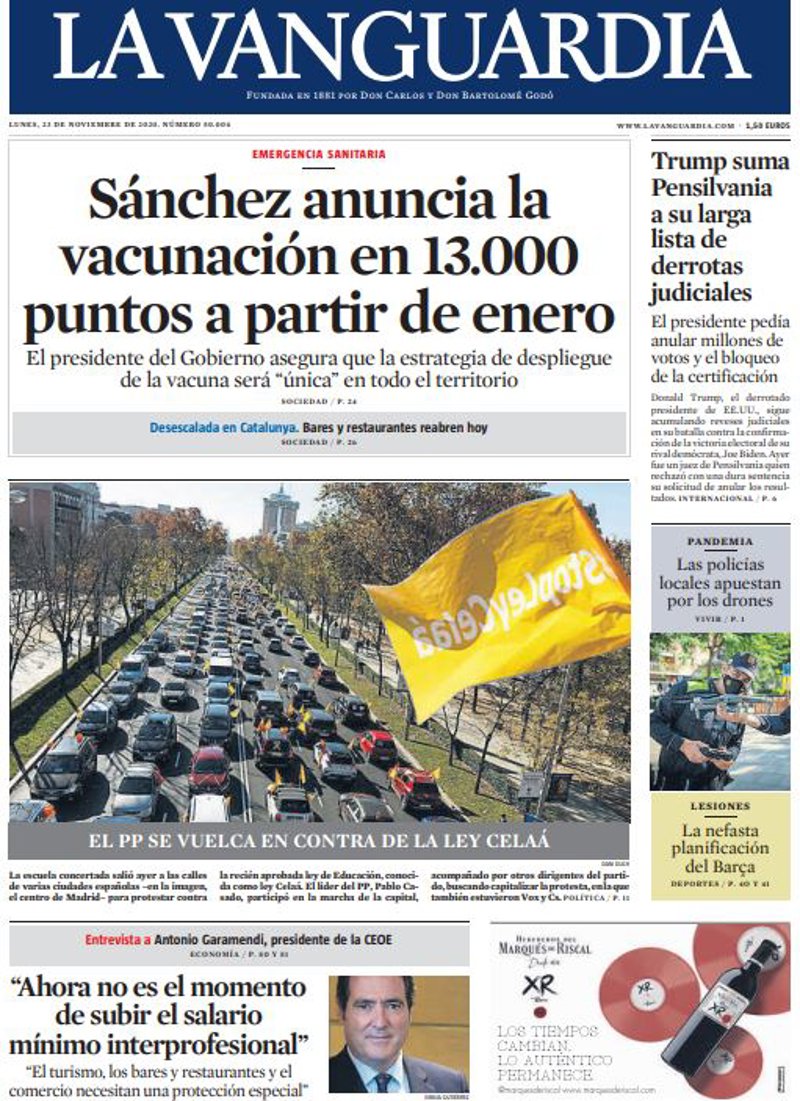 LA VANGUARDIA: "Sánchez anuncia la vacunación en 13.000 puntos a partir de enero"; "Entrevista a Antonio Garamendi, presidente de CEOE: "Ahora no es el momento de subir el salario mínimo interprofesional""; "Trump suma Pensilvania a su larga lista de derrotas judiciales".