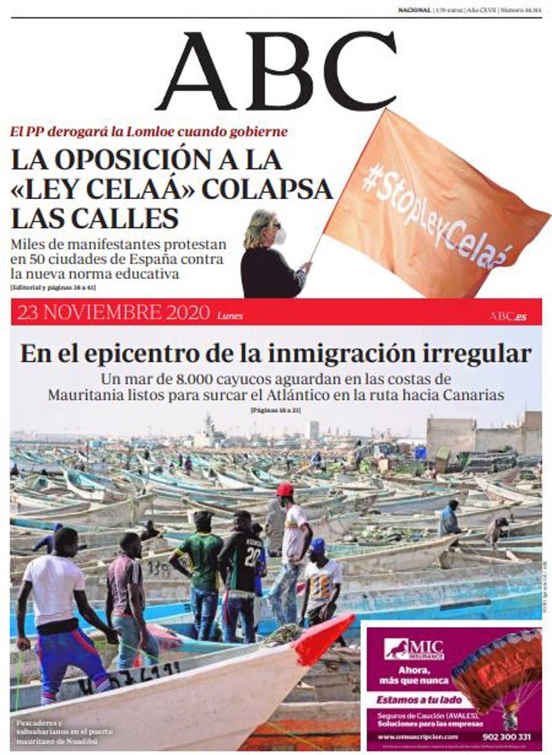 ABC: "La oposición a la 'ley Celaá' colapsa las calles. Miles de manifestantes protestan en 50 ciudades de España contra la nueva norma educativa"; "En el epicentro de la inmigración irregular. Un mar de 8.000 cayucos aguardan en las costas de Mauritania listos para surcar el Atlántico en la ruta hacia Canaria".