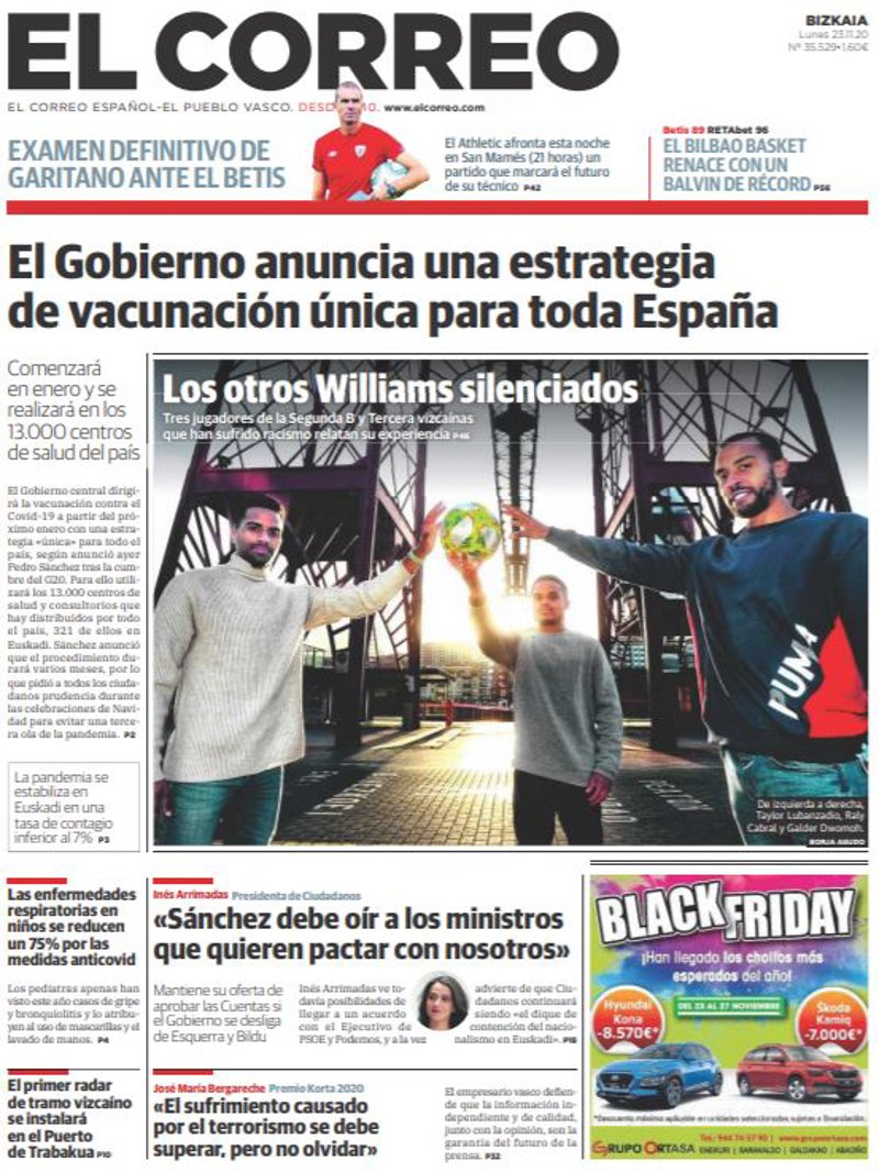 EL CORREO: "El Gobierno anuncia una estrategia de vacunación única para toda España"; "Inés Arrimadas, presidenta de Ciudadanos: "Sánchez debe oír a los ministros que quieren pactar con nosotros""; "José María Bergareche, Premio Korta 2020: "El sufrimiento causado por el terrorismo se debe superar, pero no olvidar""; "Las enfermedades respiratorias en niños se reducen un 75% por las medidas anticovid"; "El primer radar de tramo vizcaíno se instalará en el Puerto de Trabaku".