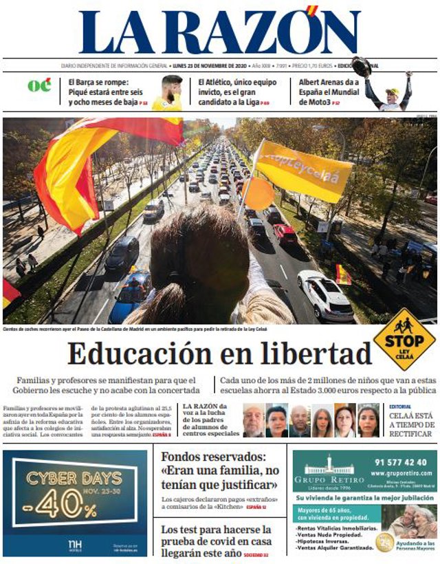 LA RAZÓN: "Educación en libertad"; "Fondos reservados: "Eran una familia, no tenían que justificar""; "Los test para hacerse la prueba de covid en casa llegarán este año".