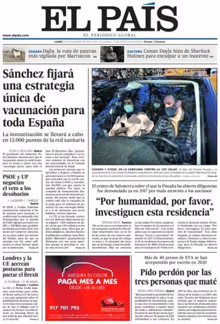 toda España"; ""Por humanidad, por favor, investiguen esta residencia""; "Más de 40 presos de ETA se han arrepentido por escrito en 2020. Pido perdón por las tres personas que maté"; "PSOE y UP negocian el veto a los desahucios"; "Londres y la UE acercan posturas para pactar el Brexit".