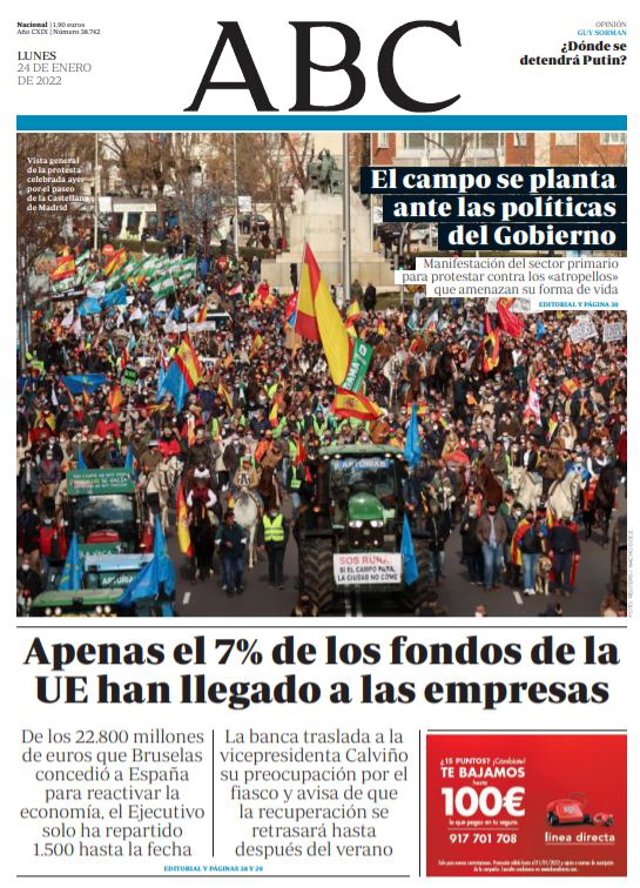ABC: "El campo se planta ante las políticas del Gobierno"; "Apenas el 7% de los fondos de la UE han llegado a las empresas".