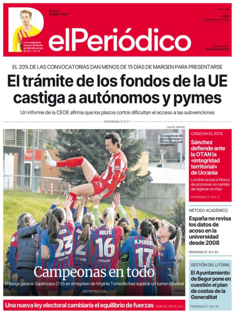 EL PERIÓDICO: "El trámite de los fondos de la UE castiga a autónomos y pymes"; "Campeonas en todo"; "Sánchez defiende ante la OTAN la 'integridad territorial' de Ucrania"; "España no revisa los datos de acoso en la universidad desde 2008"; "El Ayuntamiento de Begur pone en cuestión el plan de costas de la Generalitat".