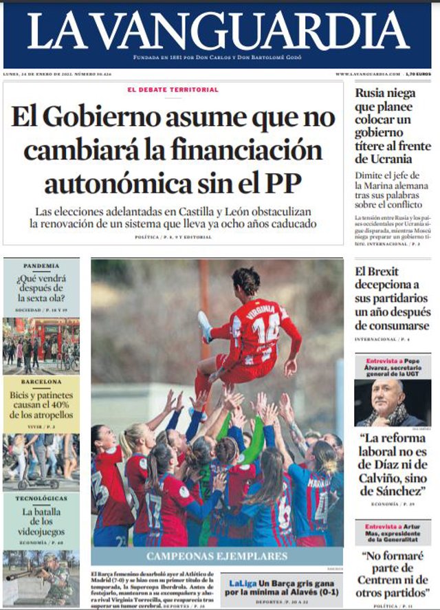 LA VANGUARDIA: "El Gobierno asume que no cambiará la financiación autonómica sin el PP"; "Rusia niega que planee colocar un gobierno títere al frente de Ucrania"; "El Brexit decepciona a sus partidarios un año después de consumarse"; "'La reforma laboral no es de Díaz ni de Calviño, sino de Sánchez'"; "'No formaré parte de Centrem ni de otros partidos'".