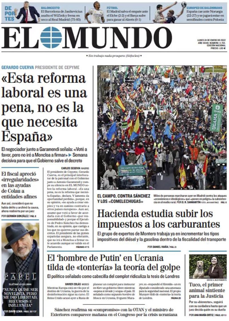 EL MUNDO: "'Esta reforma laboral es una pena, no es la que necesita España'"; "Hacienda estudia subir los impuestos a los carburantes"; "El 'hombre de Putin' en Ucrania tilda de 'tontería' la teoría del golpe".