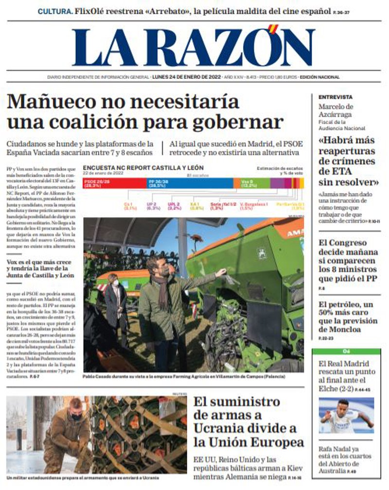 LA RAZÓN: "Mañueco no necesitaría una coalición para gobernar"; "El suministro de armas a Ucrania divide a la Unión Europea"; "'Habrá más reaperturas de crímenes de ETA sin resolver'"; "El Congreso decide mañana si comparecen los 8 ministros que pidió el PP"; "El petróleo, un 50% más caro que la previsión de Moncloa".