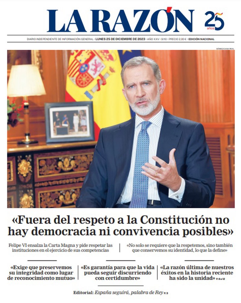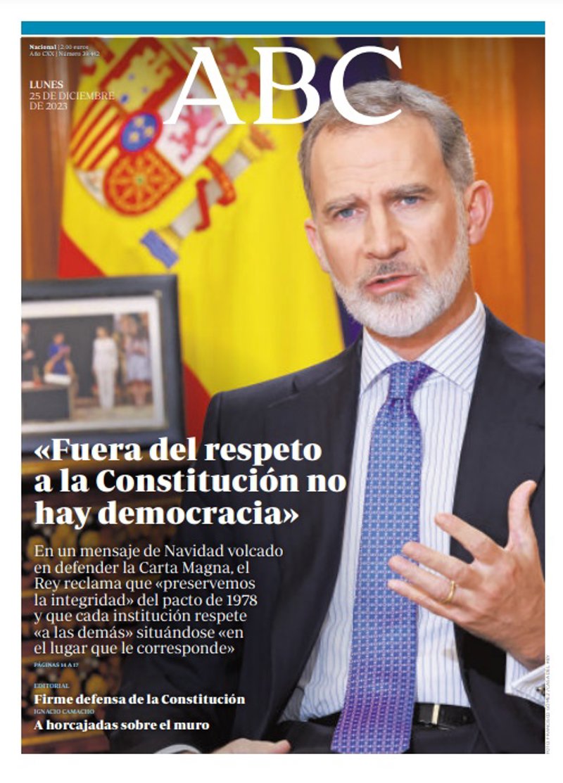 ABC: ""Fuera del respeto a la Constitución no hay democracia". En un mensaje de Navidad volcado en defender la Carta Magna, el Rey reclama que "preservemos la integridad" del pacto de 1978 y que cada institución respete "a las demás" situándose "en el lugar que le corresponde"".