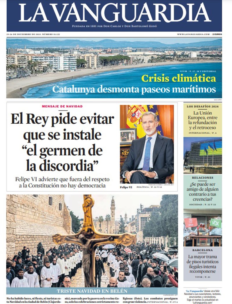 LA VANGUARDIA: "El Rey pide evitar que se instale "el germen de la discordia""; "Triste Navidad en Belén"; "La Unión Europea, entre la refundación y el retroceso".