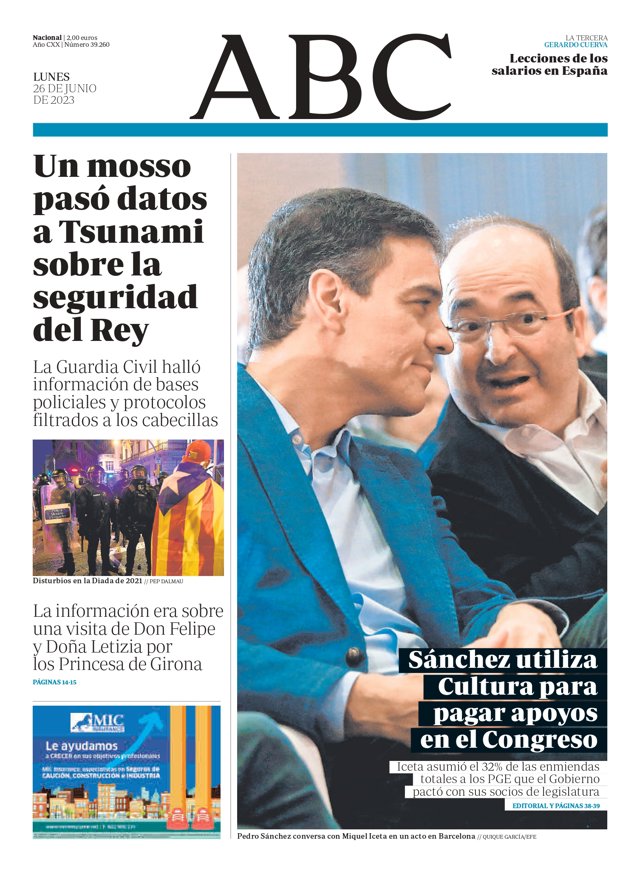 ABC: "Un mosso pasó datos a Tsunami sobre la seguridad del Rey"; "Sánchez utiliza Cultura para pagar apoyos en el Congreso".