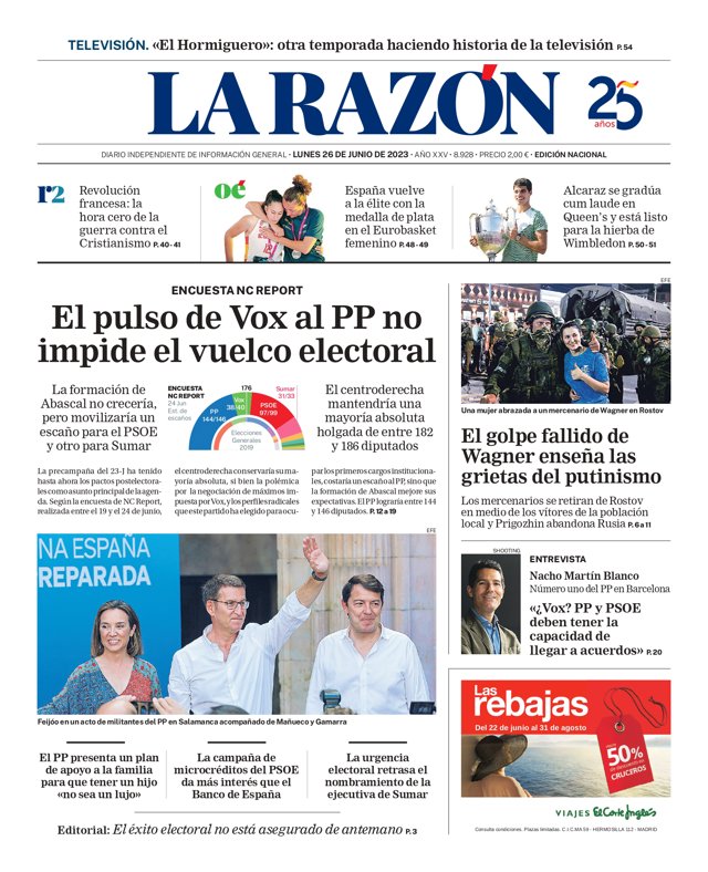 LA RAZÓN: "El pulso de Vox al PP no impide el vuelco electoral"; "El golpe fallido de Wagner enseña las grietas del putinismo".