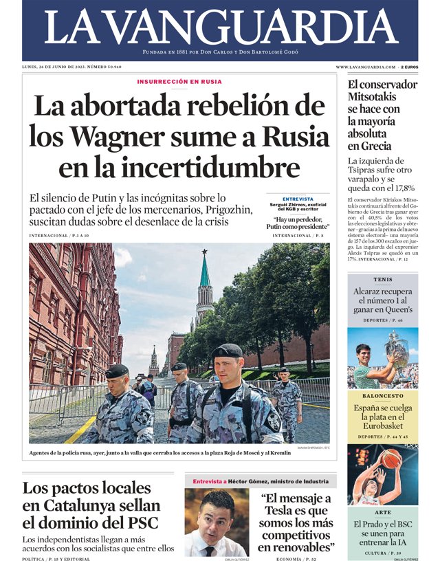 LA VANGUARDIA: "La abortada rebelión de los Wagner sume a Rusia en la incertidumbre"; "El conservador Mitsotakis se hace con la mayoría absoluta en Grecia"; "Los pactos locales en Catalunya sellan el dominio del PSC"; "Héctor Gómez: El mensaje a Tesla es que somos los más competitivos en renovables".