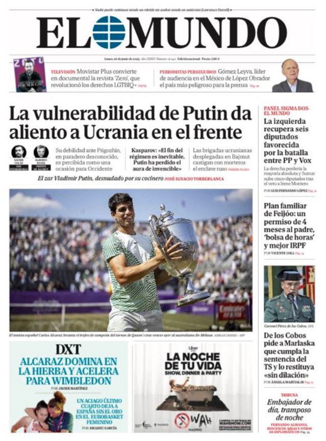 EL PAÍS: "EE UU cree que el motín de Wagner destapa las "grietas" del Kremlin"; "El conservador Mitsotakis gana en Grecia con mayoría absoluta"; "Feijóo se alinea con Vox y acusa al Gobierno de "politizar" la familia"; "Más de 1.000 acusados de pederastia en la Iglesia española"; "Solo 12.000 hipotecados se apuntan al plan de rescate que pactó la banca".