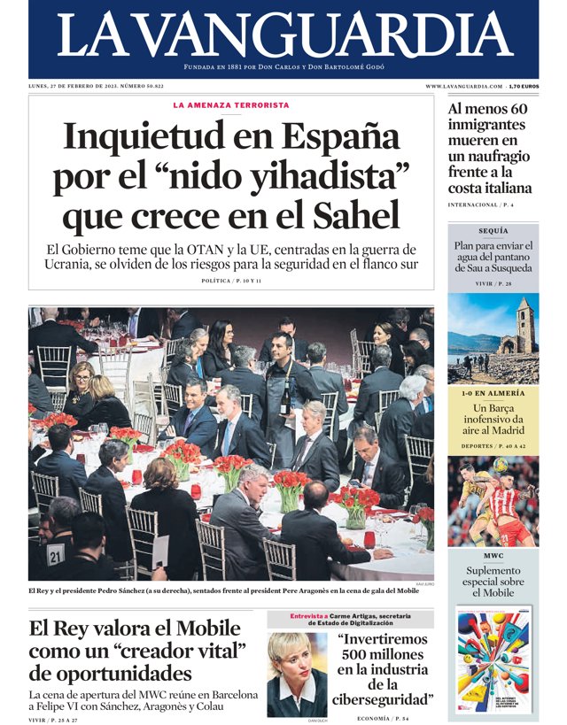 LA VANGUARDIA: "Inquietud en España por el "nido yihadista" que crece en el Sahel"; "Al menos 60 inmigrantes mueren en un naufragio frente a la costa italiana"; "El Rey valora el Mobile como un "creador vital" de oportunidades"; "Carme Artigas: Invertiremos