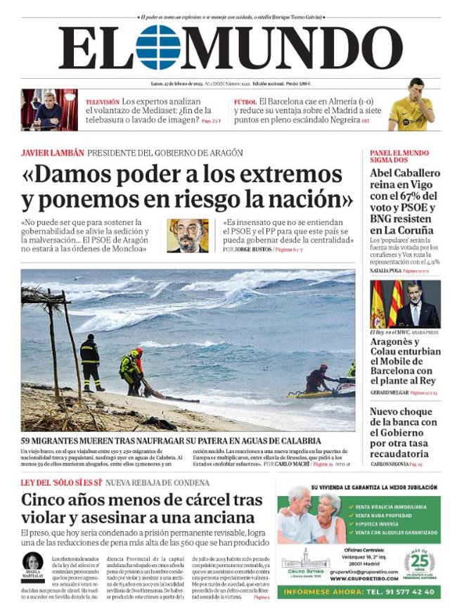 EL MUNDO:"Damos poder a los extremos y ponemos en riesgo la nación"; "Sigma Dos: Abel Caballero reina en Vigo con el 67% del voto y PSOE y BNG resisten en La Coruña"; "Aragonès y Colau enturbian el Mobile de Barcelona con el plante al Rey"; "Nuevo choque de la banca con el Gobierno pero por otra tasa recaudatoria"; "Cinco años menos de cárcel tras violar y asesinar a una anciana".