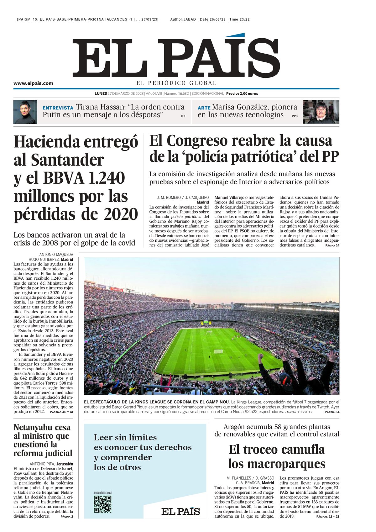 EL PAÍS: "Hacienda entregó al Santander y el BBVA 1.240 millones por las pérdidas de 2020"; "El Congreso reabre la causa de la 'policía patriótica' del PP"; "Netanyahu cesa al ministro que cuestionó la reforma judicial"; "El troceo camufla los macroparques"