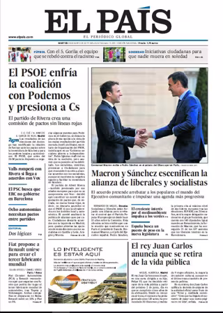 EL PAÍS: "El PSOE enfría la coalición con Podemos y presiona a Cs"; "Macron y Sánchez escenifican la alianza de liberales y socialistas"; "El rey Juan Carlos anuncia que se retira de la vida pública"; "Valls romperá con Rivera si llega a acuerdos con Vox"; "El PSC busca que ERC no gobierne en Barcelona"; "Ocho autonomías necesitan pactos entre partidos"; "Fiat propone a Renault unirse para crear el tercer fabricante mundial".