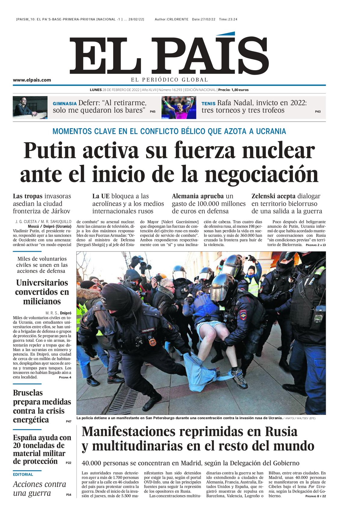 EL PAÍS: "Putin activa su fuerza nuclear ante el inicio de la negociación"; "Manifestaciones reprimidas en Rusia y multitudinarias en el resto del mundo"; "Bruselas prepara medidas contra la crisis energética"; "España ayuda con 20 toneladas de material miliar de protección".