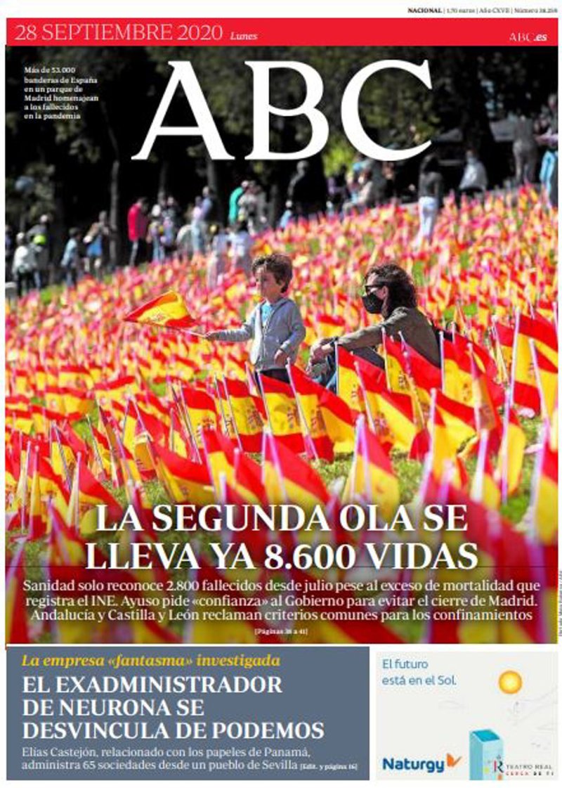 ABC: "La segunda ola ya se 8.600 vidas. Sanidad solo reconoce 2.800 fallecidos desde julio pese al exceso de mortalidad que registra el INE. Ayuso pide "confianza" al Gobierno para evitar el cierre de Madrid. Andalucía y Castilla y León reclaman criterios comunes para los confinamientos"; "El exadministrador de Neurona se desvincula de Podemos. Elías Castejón, relacionado con los papeles de Panamá, administra 65 sociedades desde un pueblo de Sevilla".