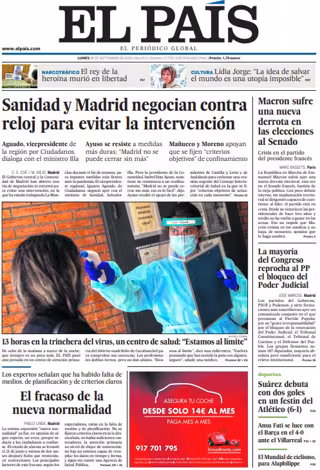 EL PAÍS: "Sanidad y Madrid negocian contra reloj para evitar la intervención"; "El fracaso de la nueva normalidad. Los expertos señalan que ha habido falta de medios, de planificación y de criterios claros"; "Macron sufre una nueva derrota en las elecciones al Senado"; "La mayoría del Congreso reprocha al PP el bloqueo del Poder Judicial".
