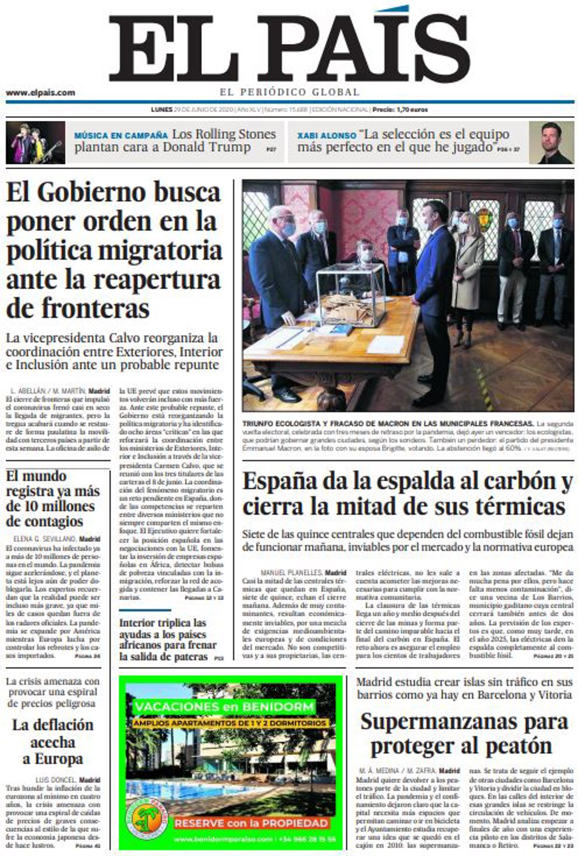 EL PAÍS: "El Gobierno busca poner orden en la política migratoria ante la reapertura de fronteras"; "España da la espalda al carbón y cierra la mitad de sus térmicas"; "El mundo registra ya más de 10 millones de contagios"; "La deflación acecha a Europa. La crisis amenaza con provocar una espiral de precios peligrosa"; "Supermanzanas para proteger al peatón. Madrid estudia crear islas sin tráfico en sus barrios como ya hay en Barcelona y Vitoria".