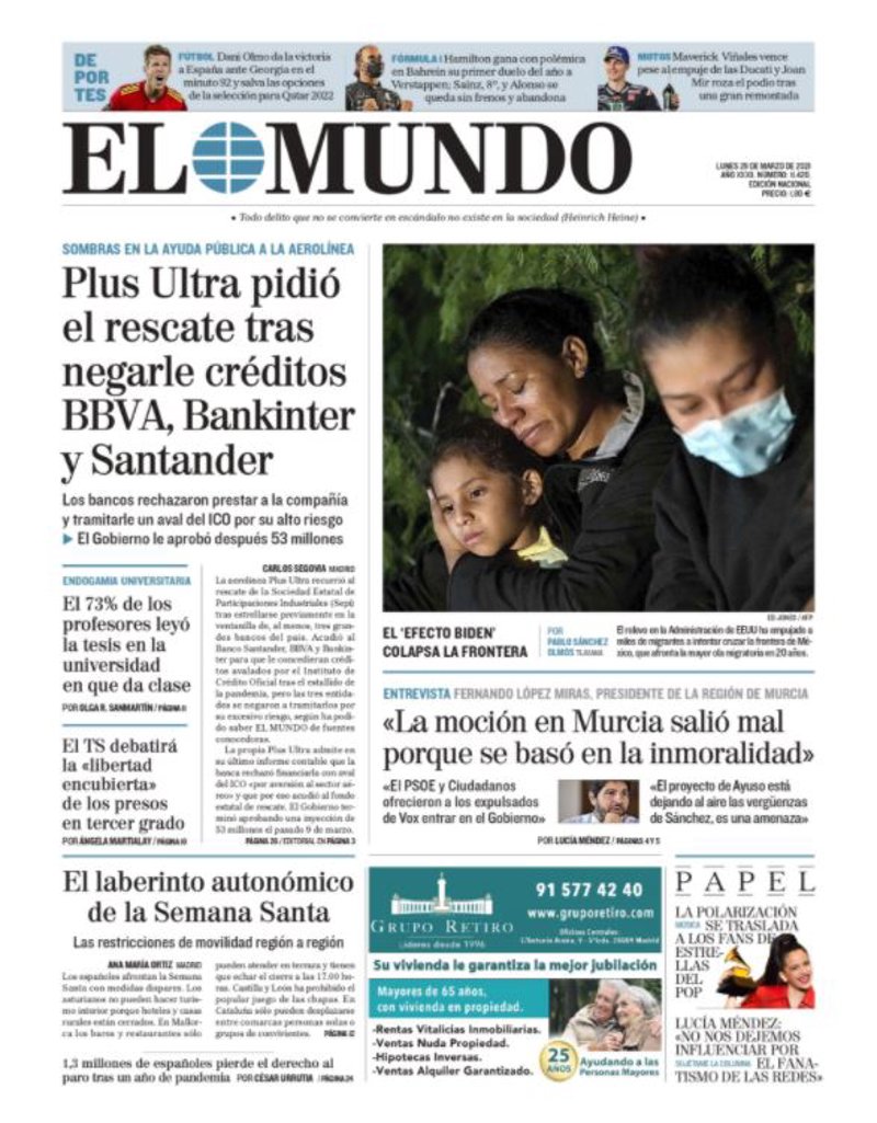 EL MUNDO: "Plus Ultra pidió el rescate tras negarle créditos BBVA, Bankinter y Santander", "La moción en Murcia salió mal porque se basó en la inmoralidad", "El laberinto autonómico de la Semana Santa", "El 73% de los profesores leyó la tesis en la universidad en la que da clase", "El TS debatirá la 'libertad encubierta' de los presos en tercer grado", "El 'efecto Biden' colapsa la frontera", "1,3 millones de españoles pierde el derecho a paro tras un año de pandemia".