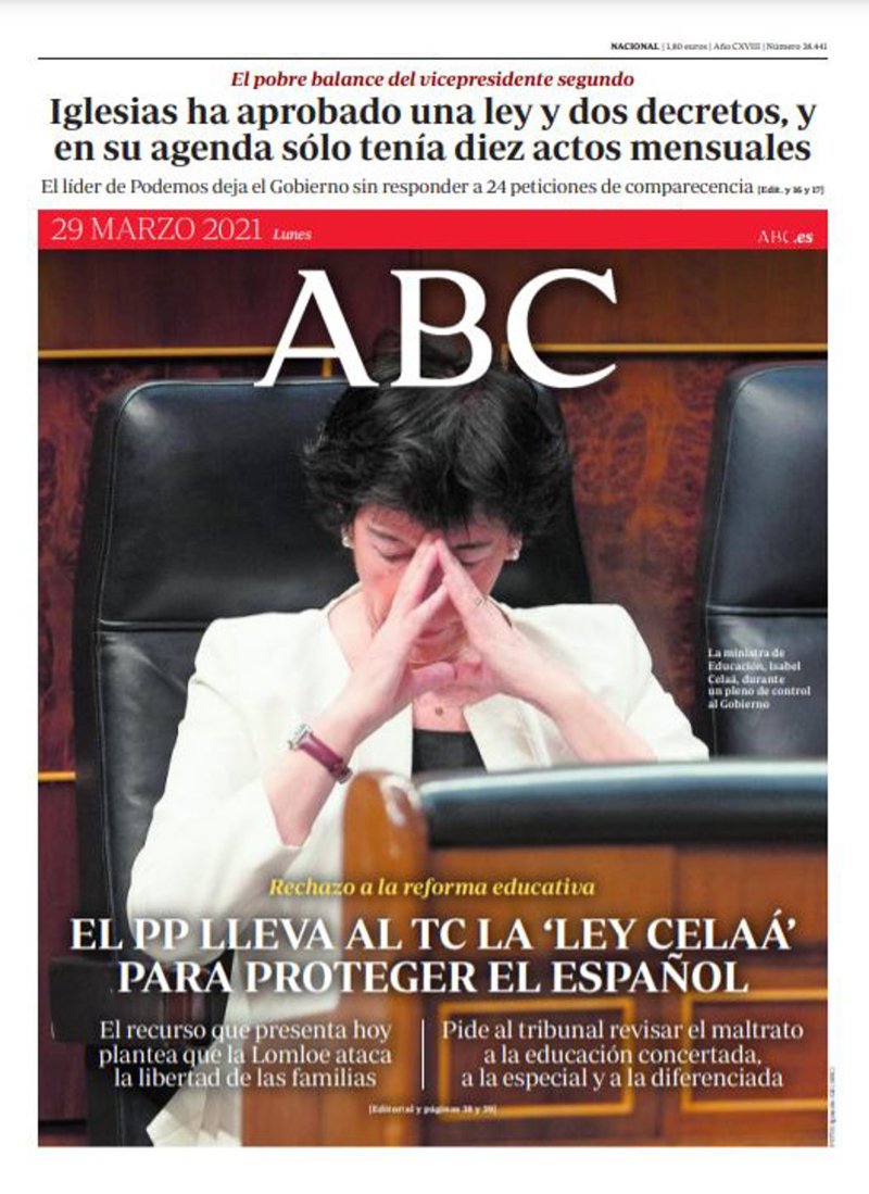 ABC: "El PP lleva al TC la 'ley Celaá' para salvar el español", "Iglesias ha aprobado una ley y dos decretos, y en su agenda sólo tenía diez actos mensuales", "El recurso que presenta hoy plantea que la Lomloe ataca la libertad de las familias", "Pide al tribunal revisar el maltrato a la educación concertada, a la especial y a la diferenciada".