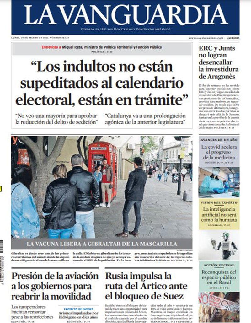 LA VANGUARDIA: "'Los indultos no están supeditados al calendario electoral, están en trámite'", "ERC y Junts no logran desencallar la investidura de Aragonès", "Presión de la aviación a los gobiernos para reabrir la movilidad", "Rusia impulsa la ruta del Ártico ante el bloqueo de Suez", "Los turoperadores intentan remontar pese a las restricciones", "Aviones impulsados por hidrógeno en diez años".
