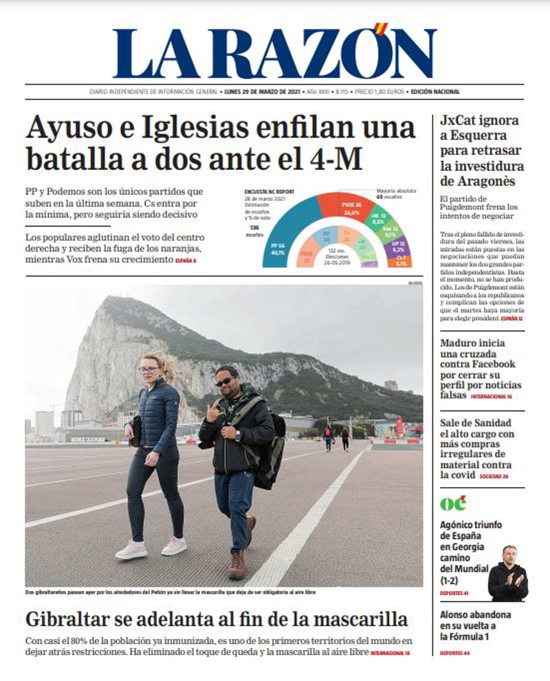 LA RAZÓN: "Ayuso e Iglesias enfilan una batalla a dos ante el 4-M", "Gibraltar se adelanta al fin de la mascarilla", "JxCat ignora a Esquerra para retrasar la investidura de Aragonès", "Maduro inicia una cruzada contra Facebook por cerrar su perfil por noticias falsas", "Sale de Sanidad el alto cargo con más compras irregulares de material contra la covid", "Agónico triunfo de España en Georgia camino del Mundial (1-2)", "Alonso abandona en su vuelta a la Fórmula 1".