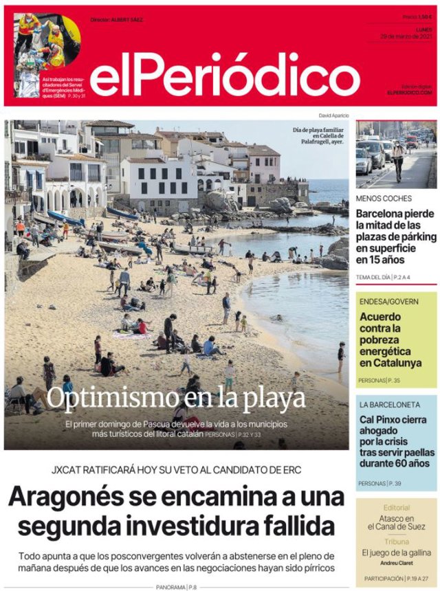 EL PERIÓDICO: "Aragonès se encamina a una segunda investidura fallida", "Optimismo en la playa", "Barcelona pierde la mitad de las plazas de párking en superficie en 15 años", "Acuerdo contra la pobreza energética en Catalunya", "Cal Pinxo cierra ahogado por la crisis tras servir paellas durante 60 años".
