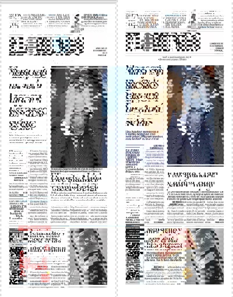EL MUNDO: "Villarejo espió una cena de Rajoy con el Ibex y ofreció sus datos"; "El Barça golea al Madrid y sentencia a Lopetegui"; "El retroceso de los aliados de Merkel en Hesse amenaza al Gobierno alemán"; "Tormento para herejes en La Rambla"; "Mentiras, insultos y 'mossos': así fue la huida de Puigdemont".