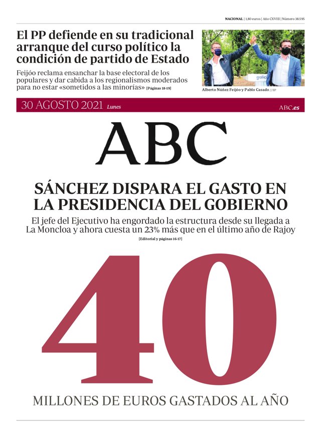 ABC: "El PP defiende en su tradicional arranque del curso político la condición de partido de Estado"; "Sánchez dispara el gasto en la presidencia del Gobierno".