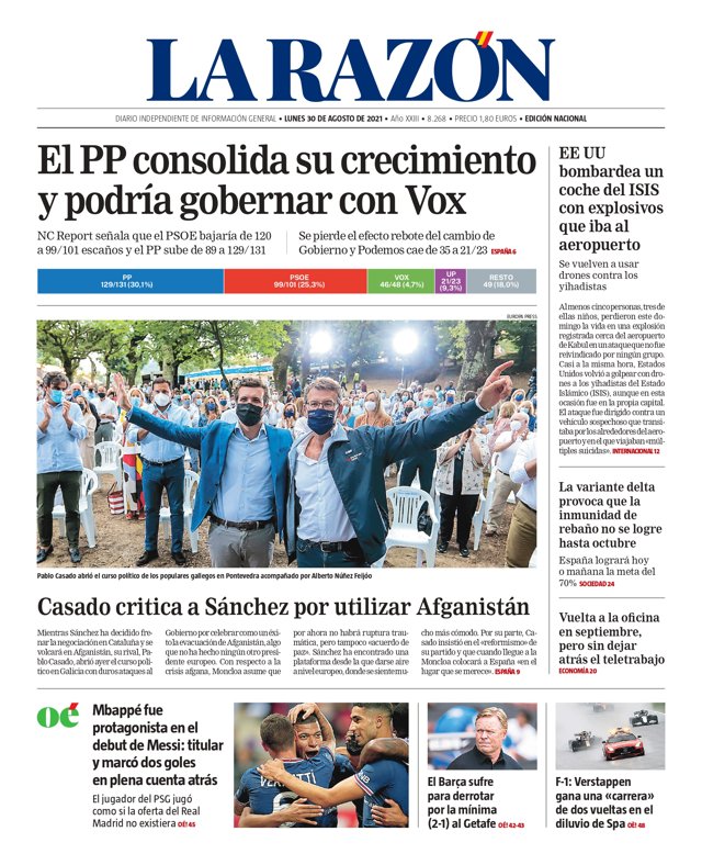 LA RAZÓN: "El PP consolida su crecimiento y podría gobernar con Vox"; "EEUU bombardea un coche del ISIS con explosivos que iba al aeropuerto"; "Casado critica a Sánchez por utilizar Afganistán"; "Mbappé fue protagonista en el debut de Messi: titular y marcó dos goles en plena cuenta atrás"; "La variante delta provoca que la inmunidad de rebaño no se logre hasta octubre"; "Vuelta a la oficina en septiembre, pero sin dejar atrás el teletrabajo".