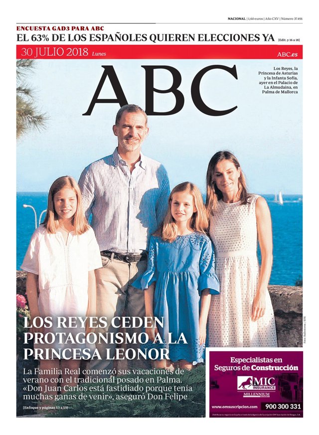 ABC: "Los reyes ceden protagonismo a la princesa Leonor", "La Familia Real comenzó sus vacaciones de verano con el tradicional posado en Palma", "Don Juan Carlos está fastidiado porque tenía muchas ganas de venir", aseguró Don Felipe.