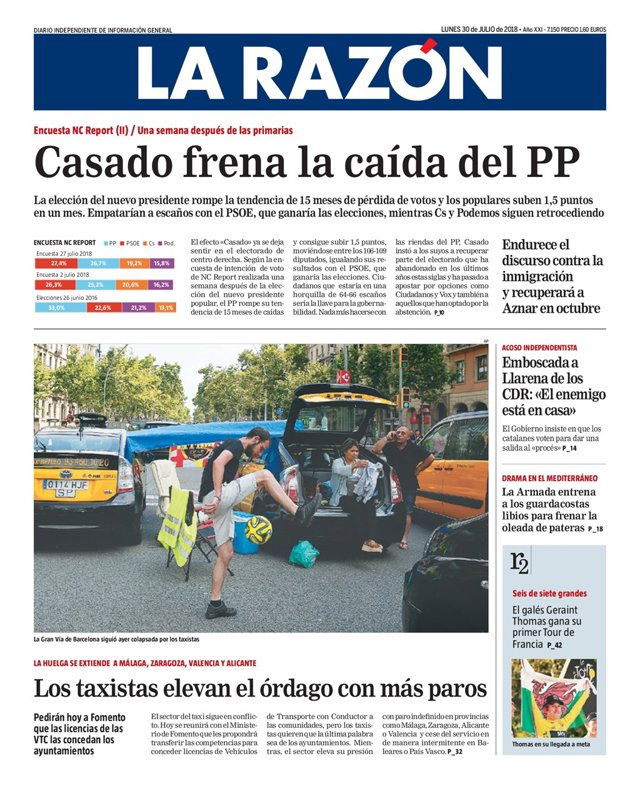 La Razón: "Casado frena la caída del PP", "La elección del nuevo presidente rompe la tendencia de 15 meses de pérdida de votos y los populares suben 1,5 puntos en un mes", "Empatarían a escaños con el PSOE, que ganaría las elecciones, mientras Ciudadanos y Podemos siguen retrocediendo"; "Los taxistas elevan el órdago con más paros".