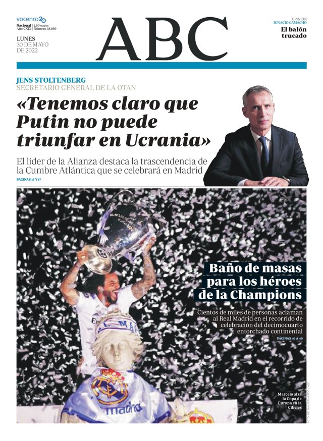 ABC: "Stoltenberg: Tenemos claro que Putin no puede triunfar en Ucrania"; "Baño de masas para los héroes de la Champions".