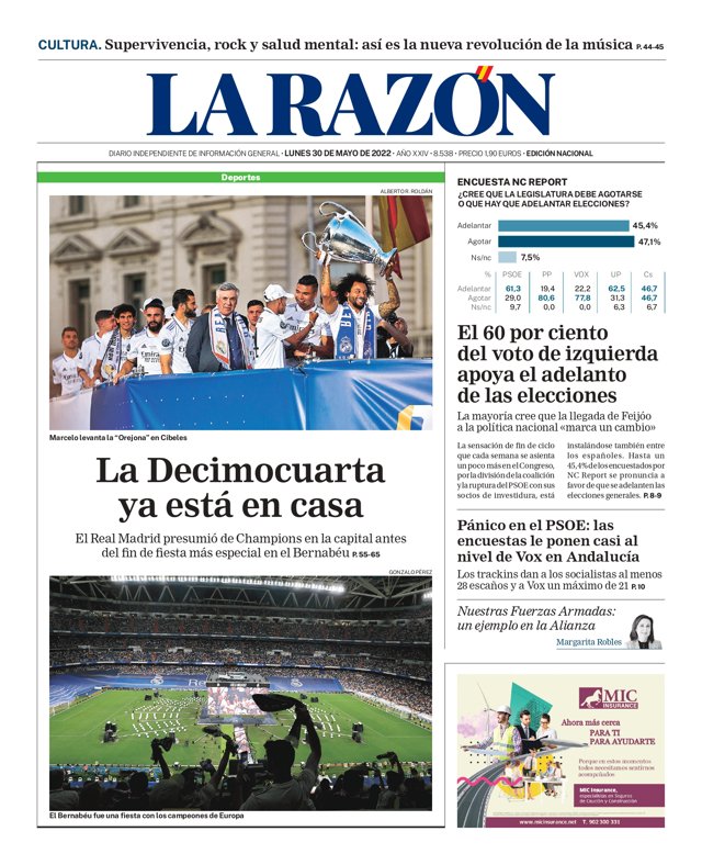 LA RAZÓN: "La Decimocuarta ya está en casa"; "El 60 por ciento del voto de izquierda apoya el adelanto de las elecciones"; "Pánico en el PSOE: las encuestas le ponen casi al nivel de Vox en Andalucía".