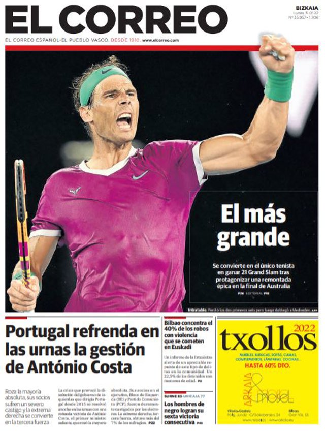 EL CORREO: "El más grande"; "Portugal refrenda en las urnas la gestión de António Costa".